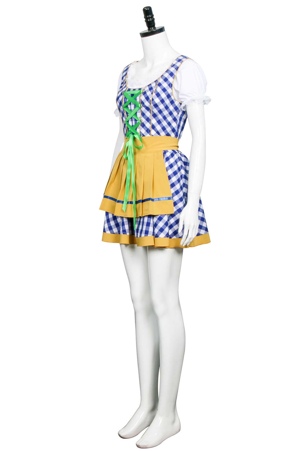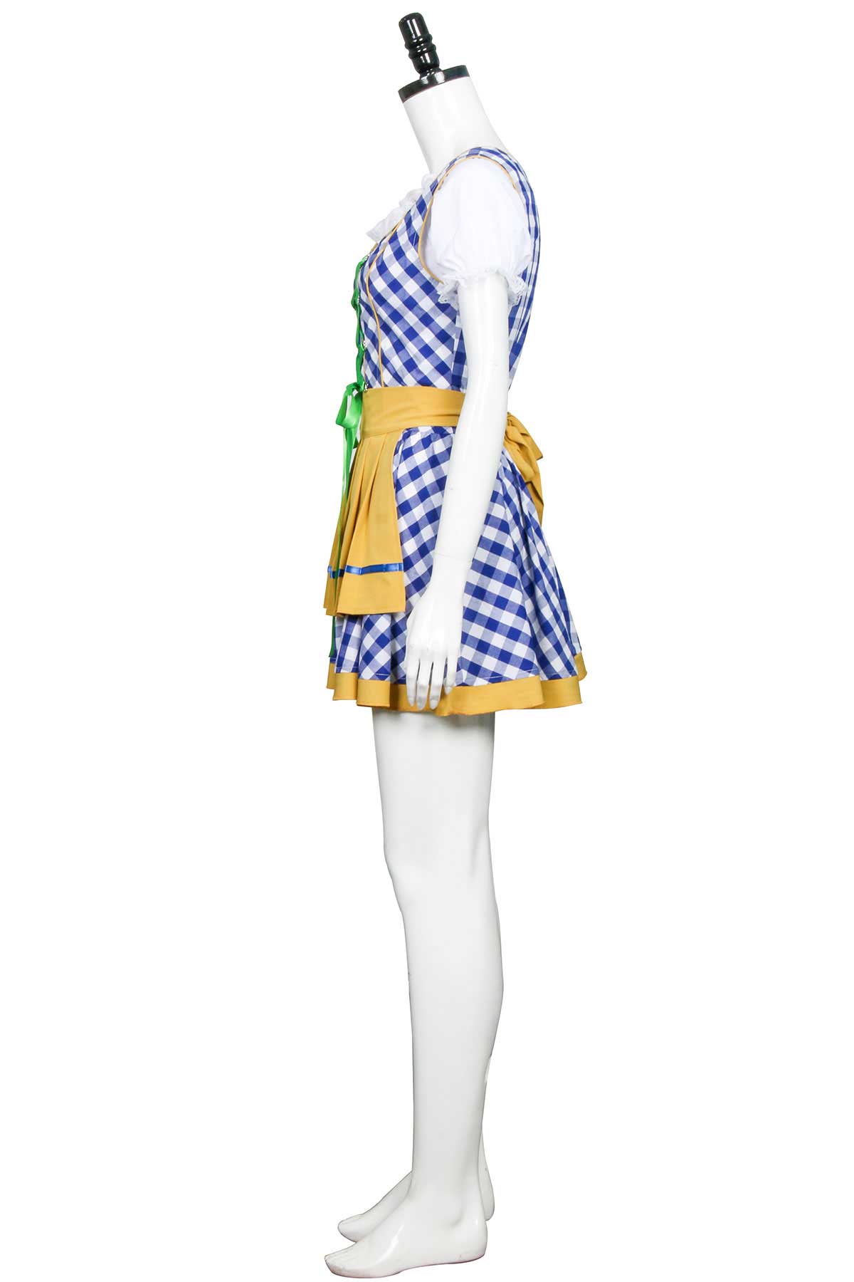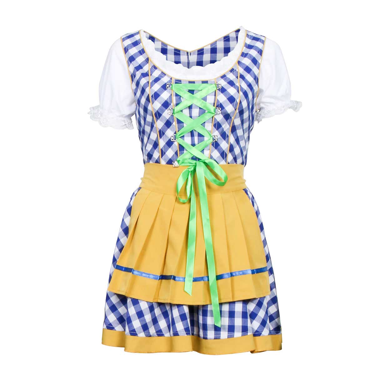 ★ Cosa c’è nella scatola:un abito blu e bianco Dirndl, un grembiule giallo, una parte superiore bianca con maniche a cappuccio.